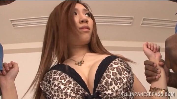 解説: Pretty Japanese AV model Honami Uehara is detained by two massive black security guys and they undress her and start to tease and pinch all her skinny body from head till feet. Taking off her sexy lingerie, the dudes finger her pink pussy and she sucks their dicks, and gets drilled by their massive schlongs.