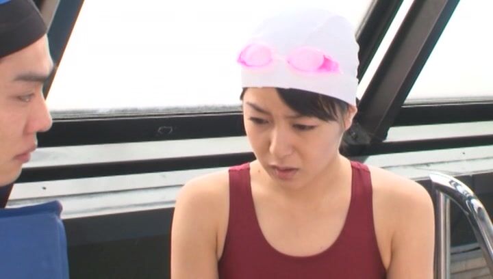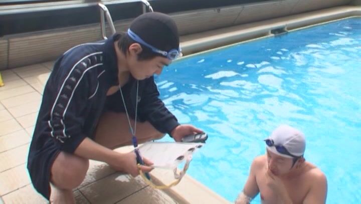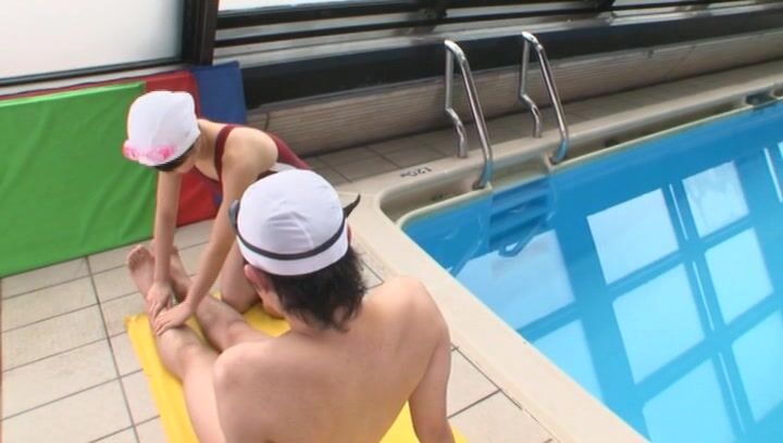 解説: A young atlete comes out of the swimmingpo ol after practice. She gets in between the legs of her partner and starts to massage his legs working her way up to his dick. she starts rubbing his growing dick and then takes out his swimming pant to suck his rock hard dick till he cums
